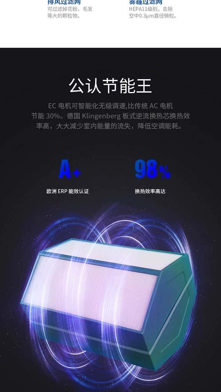 ●風(fēng)量高達(dá)415m3/h,滿足人體每小時30m3新鮮空氣的需求。